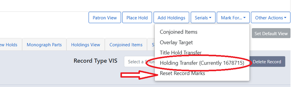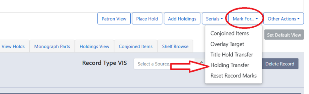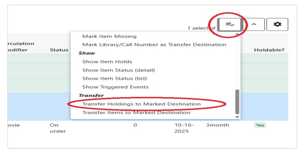 In Holdings View, select the call number you want to transfer, Click Actions list.
